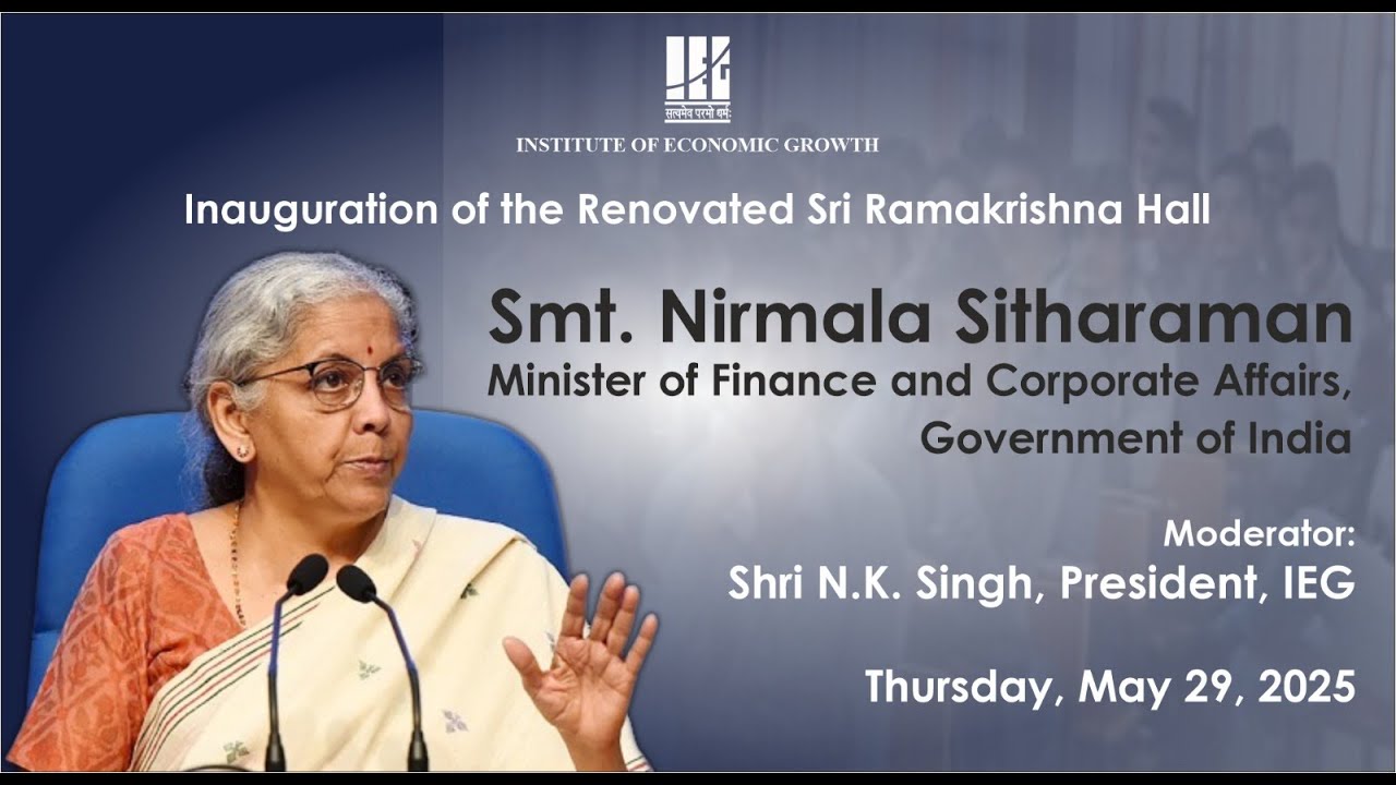 Union Finance Minister Smt. Nirmala Sitharaman inaugurated the renovated Sri Ramakrishna Hall at the Institute of Economic Growth (IEG), New Delhi, on May 29, 2025. On this occasion she also interacted with students and researchers.The engaging session, moderated by Shri N.K. Singh, President of the IEG, provided an opportunity for young scholars to exchange ideas with the Finance Minister on India’s evolving economic landscape, policy priorities, and the nation’s roadmap towards Viksit Bharat 2047.